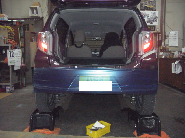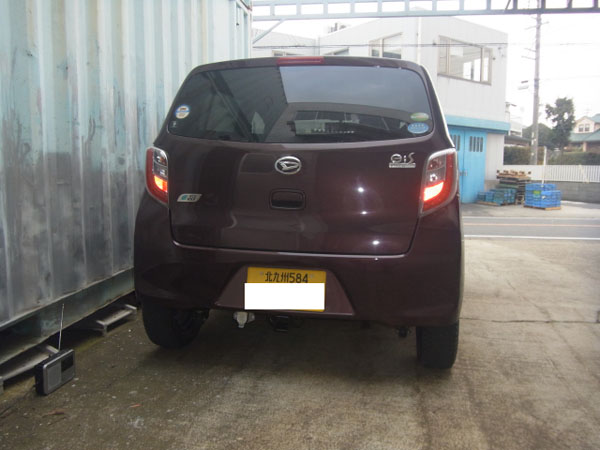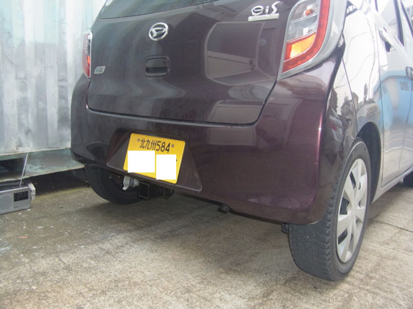 ミライースが入庫し、特注ヒッチメンバー取付しています。
