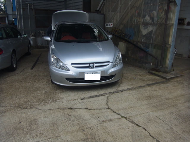 プジョーに特注ヒッチメンバー取付作業をしています。