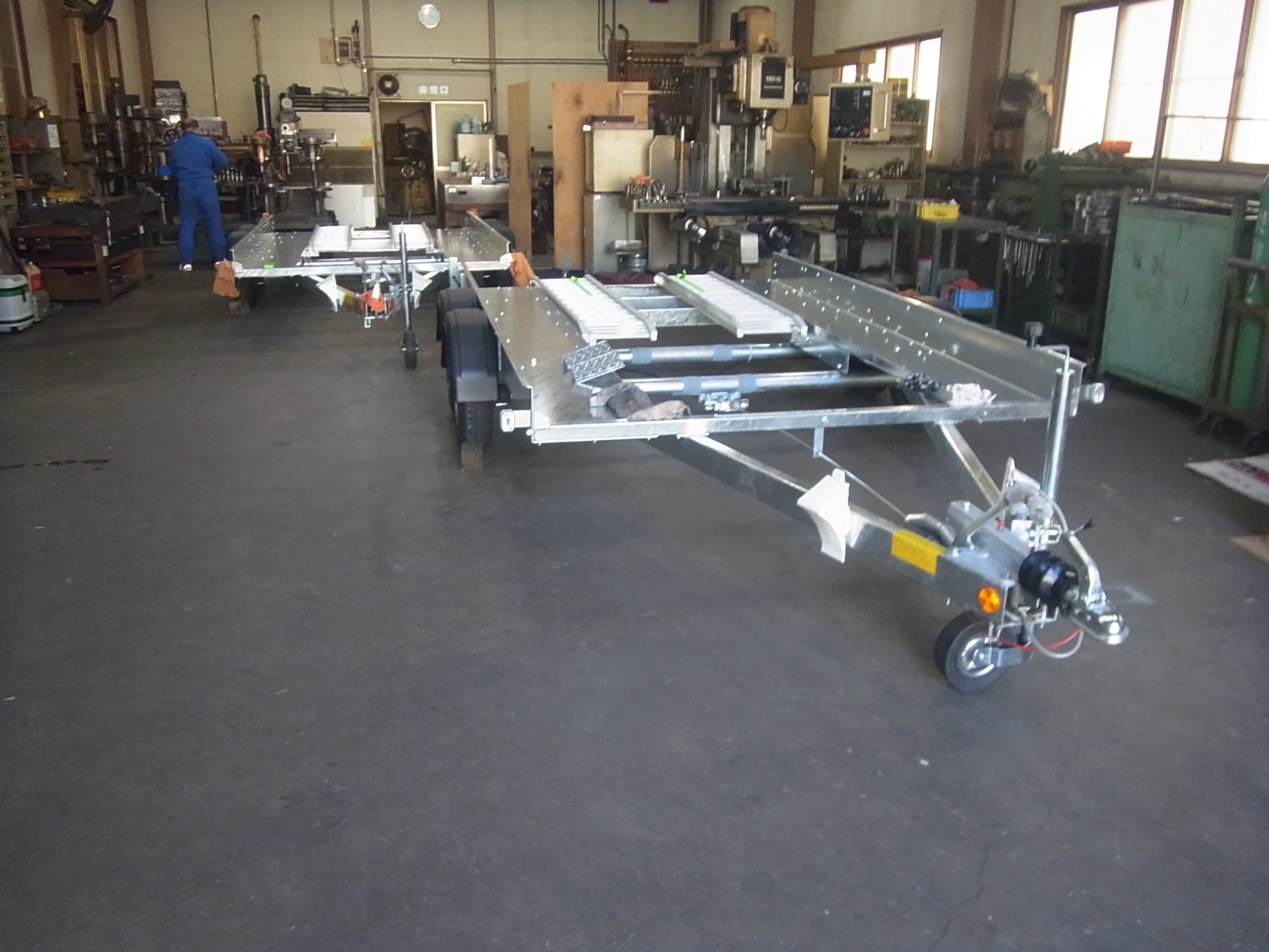 納車準備中のW84車載トレーラーが2台有るので、工場の中がいっぱいです。
