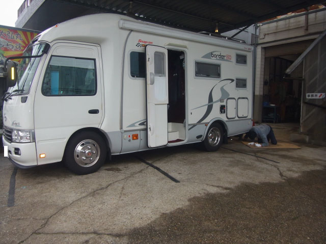 コースターベースのキャンピングカーに特注ヒッチメンバー製作取付しています。