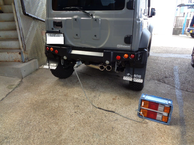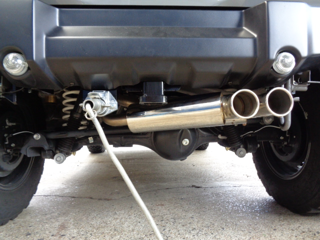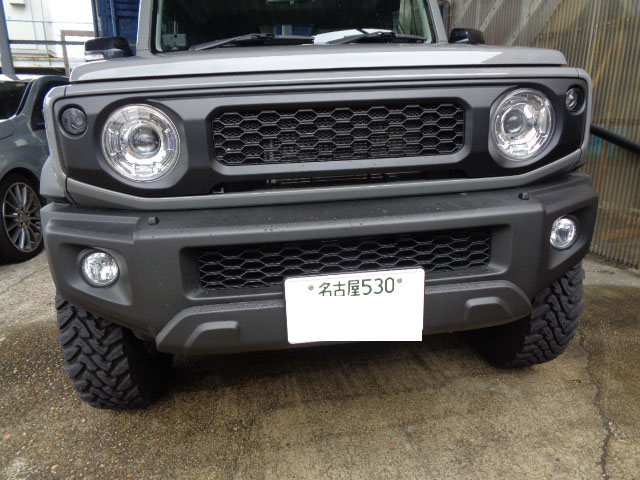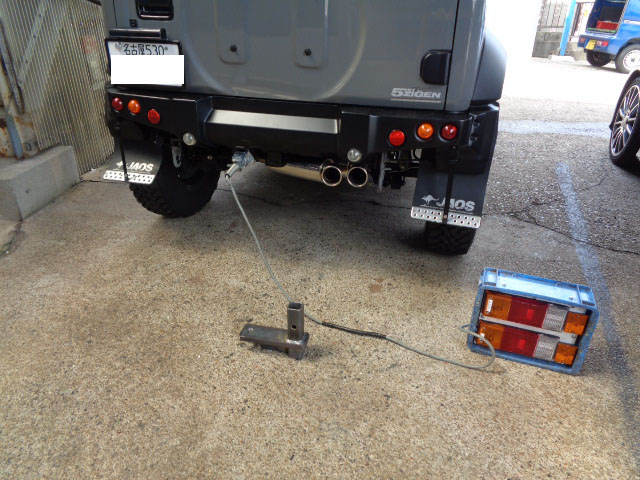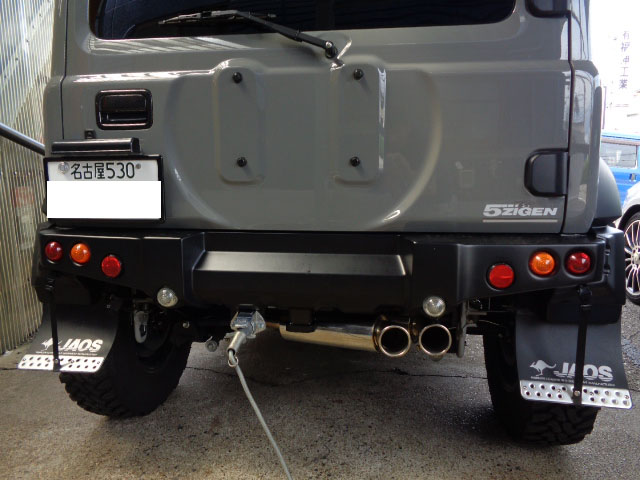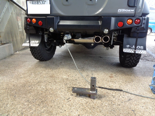 スズキジムニーシエラ 社外マフラー、社外バンパー装着車に特注ヒッチメンバー製作取付しています。