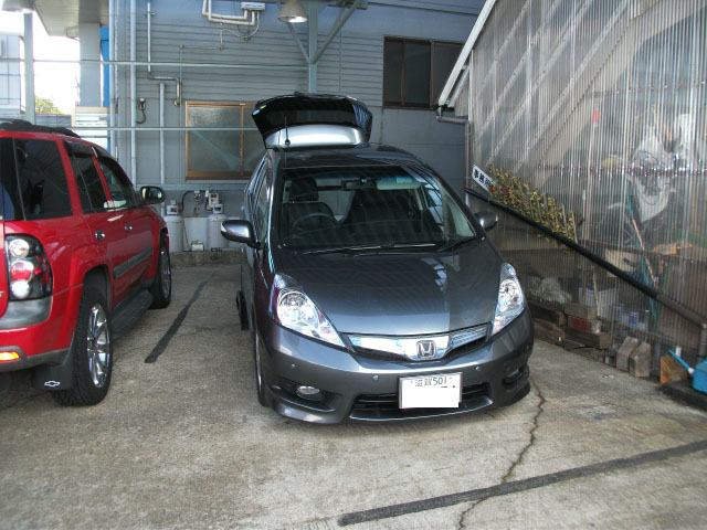 フィットシャトルハイブリッドに特注ヒッチメンバーの取付を行っています。