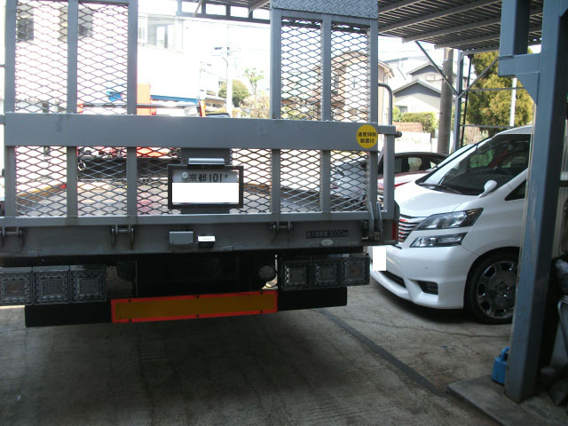 積車トラックに積まれて入庫したベルファイアにヒッチメンバー作業をしています。