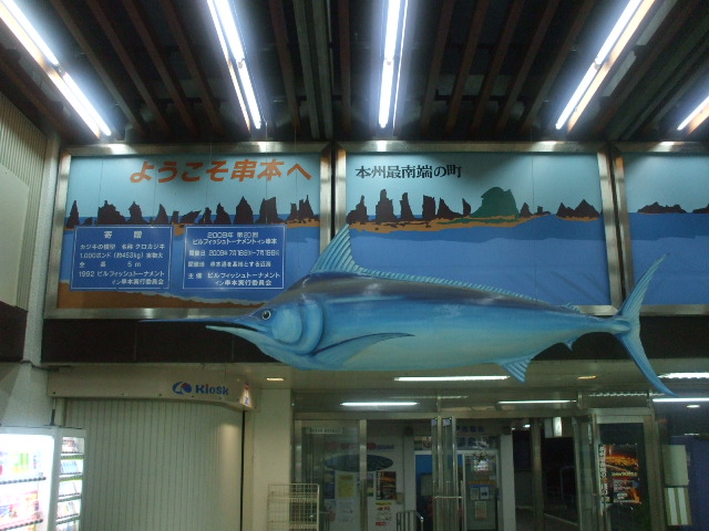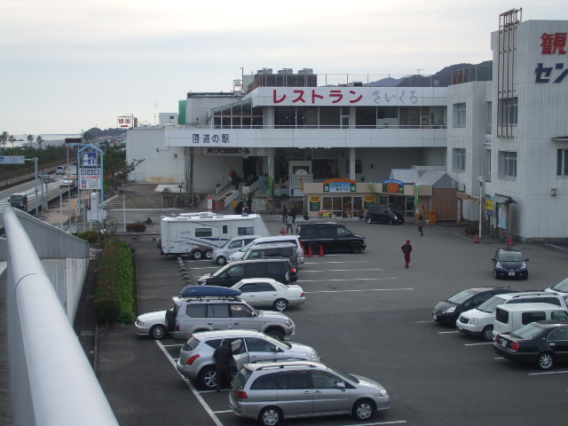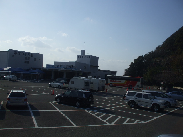 年始に何処かへ行こうと思いつつも、やっぱ暖かい所へ行こうと言う事になり、行くなら一緒に行くと言われていたY様ご一家とともに元旦の午後出発し、一路本州南端の街、串本へ。 18時頃到着し、串本漁港の桟橋へ http://kokomail.mapfan.com/receivew.cgi?MAP=E135.47.8.3N33.27.53.5&ZM=11&CI=R この漁港は広大で駐める場所に苦労しない。徒歩圏内にトイレ、コンビニ、薬局、コインランドリー、多くの食事処、そして温泉 http://www6.ocn.ne.jp/~komochan/onsenN.htm もあるとても良いP泊地。 1/2 翌朝は駅付近まで散歩し、駅には串本ビルフィッシュトーナメントの飾りが有った。下田みたいだね。 桟橋駐車場の翌朝の風景 心無い釣り人がゴミを捨てて行った様だが、僕らが捨てたと地元に方に思われたくないし、何かと目立つキャンピングカー/トレーラーなので、周辺の掃除。 朝食を済ませ、観光バスで埋め尽くされる前にと串本海中公園へ移動し、グラスボート、海中展望台、水族館を楽しみ