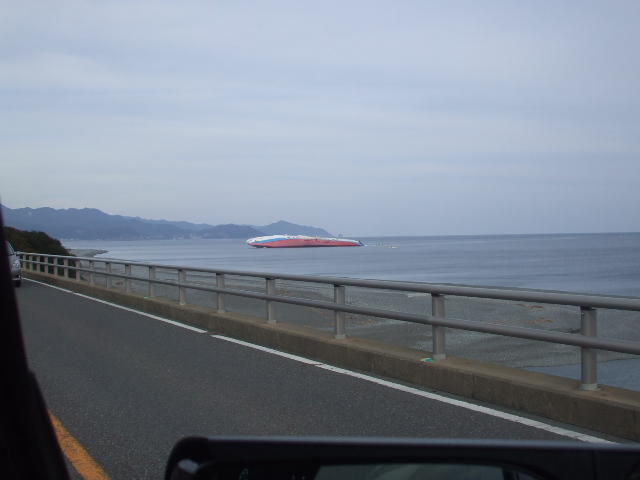 その後は潮岬タワーとその前の芝生広場 (一応キャンプ場があるが、テントキャンパー用) 樫野崎灯台の駐車場 日米修交記念館(道路はかなり狭い。一応大型観光バスコースになっていた) を見学し、奥のいかにも紀伊半島熊野灘らしい景色の海金剛を散策し 串本漁港で再度P泊。 1/3 朝の周辺掃除、コイランドリーでの洗濯を済ませ、太地のくじら浜へ 帰路、七里御浜にあった道の駅に併設のスーパーマーケットで買い物をして、Y家と解散。 七里御浜沿いのR42からは横転座礁したフェリーも見えた。 いつものように四日市渋滞が激しいので、伊勢道のPAでそのままP泊。1/4の午前中に帰宅でした。 http://fukushin-ind.com/