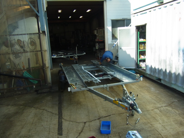 神戸のT様がお越しくださいまして、W84車載トレーラーにオプション部品装着や使い勝手向上の為の作業をしています。