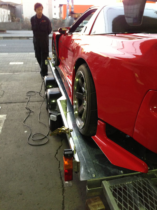 積み込むNSXのリアタイヤセッティング変更などに対応する為、去年10月に荷台改造をしたトレーラーに積み込んだ画像をお客様から頂きました。
