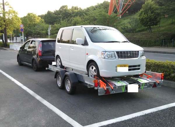 6/16に納車させて頂いてたのですが、ここ数日あまりにバタバタしていたので今更ブログアップ 三菱コルトに特注ヒッチメンバー取り付けしてW84車載トレーラーを納車しました。 本来はシルビアを積む予定ですが、引き取りにお越しになったEKワゴンを積んでお帰りに。 FF車のEKワゴンはバックで積むと、重心バランスが取れます。 お客様、かなり悩んだ末のコルトでの牽引。 凄い組み合わせでしょう。 こちらも事前に車両確認したときに、ヒッチメンバーは無理有るけど何とかなるやろと。 お客様が三菱の整備士でしたので、リスクを説明の上、定期点検必須でお受けすることに。 実際にEKワゴンを積んで、弊社周辺を私が運転して試運転。 マニュアルミッションで意外と軽快に走り、拍子抜け。ターボが効くと結構パワフル。 軽量化されたシルビアなら何とかこの状態で走れそう。 但し、無理は絶対禁物 http://www.snotr.com/video/7516/Fishtail_fail 安全な速度での牽引走行を A様、弊社にご依頼下さいまして誠にありがとうございました。 |