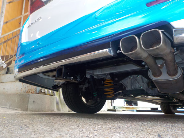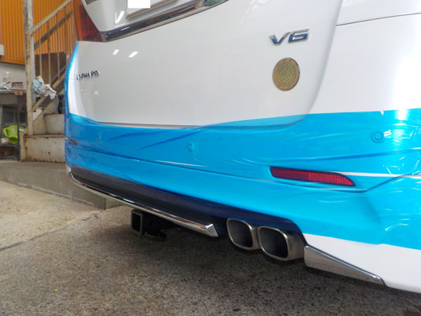 アルファード 3.5L-V6 モデリスタエアロ マフラー装着車に特注ヒッチメンバー製作取付しています。