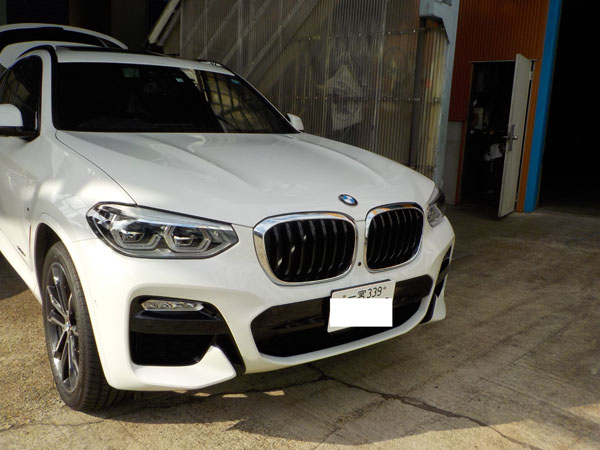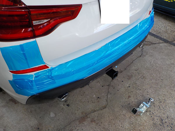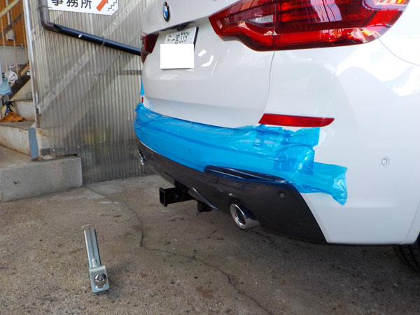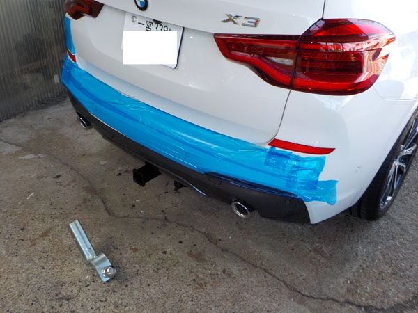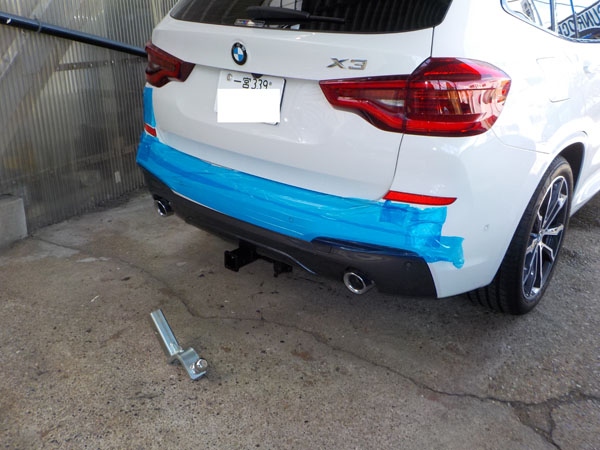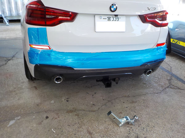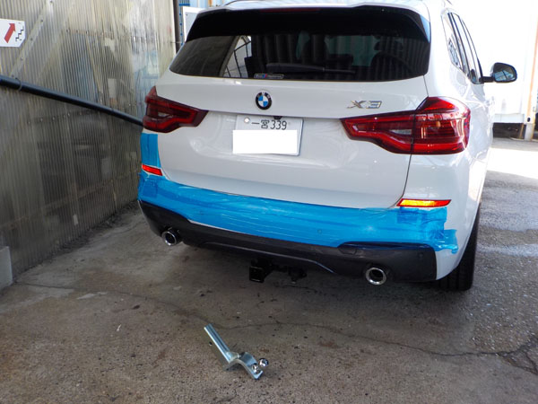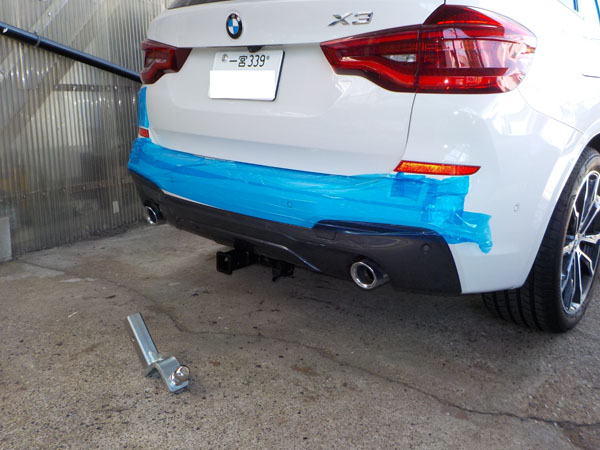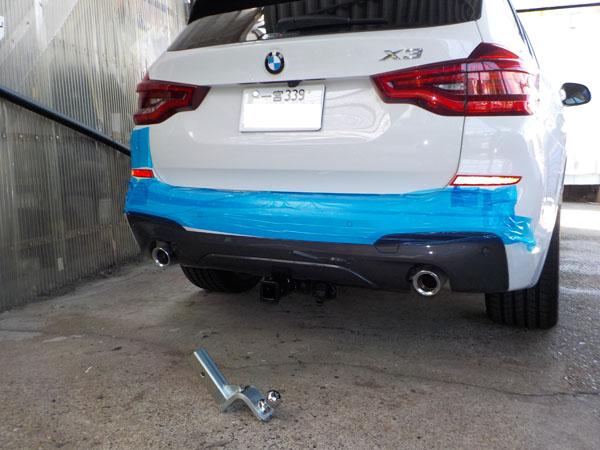 BMW X3 が入庫し、特注ヒッチメンバー製作取付しています。