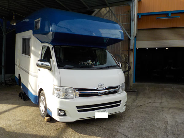 ハイエースのキャブコンバージョンが入庫し、特注ヒッチメンバー製作取付しています。