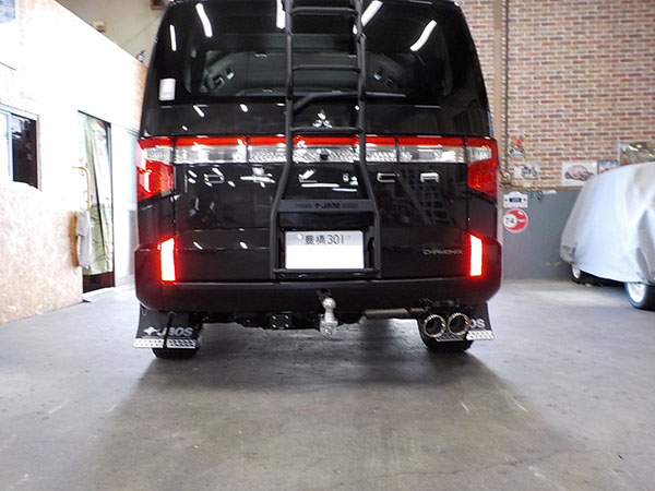 デリカD5 社外マフラー、FFヒーター装着車に特注ヒッチメンバー製作取付しています。