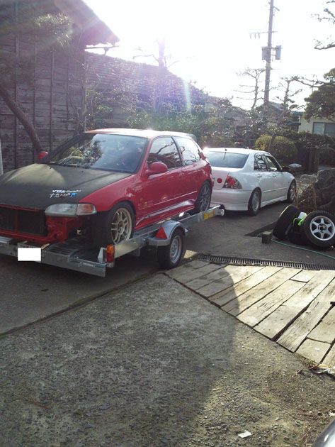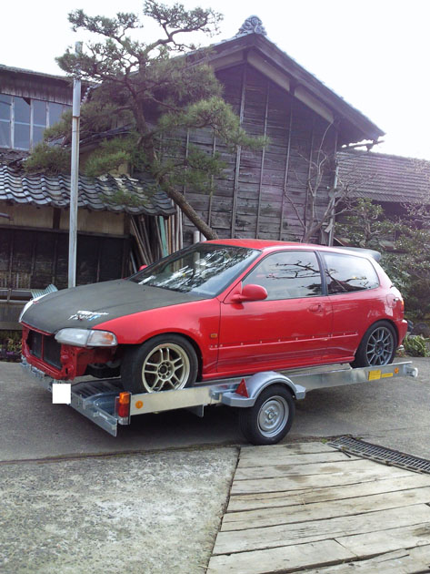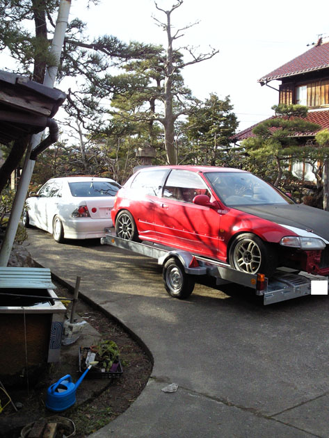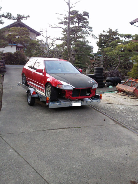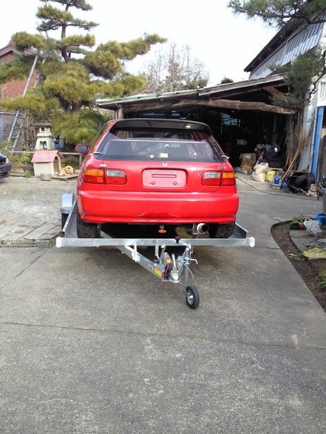 FF車の場合、前軸と後軸の加重配分が極端にフロントヘビーで、前向きに積むと、ヒッチ加重が数百キログラムになってしまい、とてもじゃないが牽引して走行できないので、多くの場合後ろ向きに積むことになります。