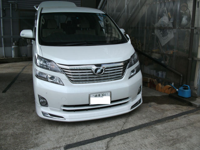 ヴェルファイアのエアロ付き車両に特注ヒッチメンバー取付作業を行っています。