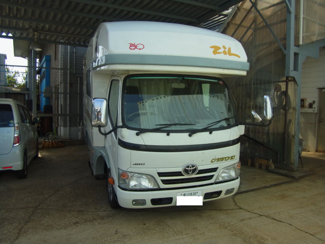 カムロードベースのキャンピングカーに特注ヒッチメンバー取付作業をしています。