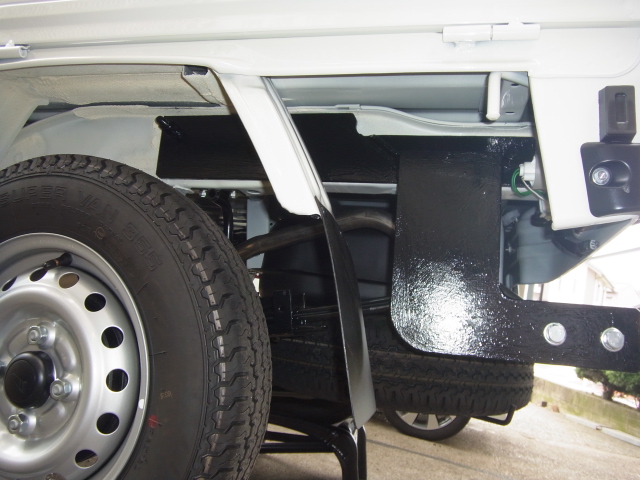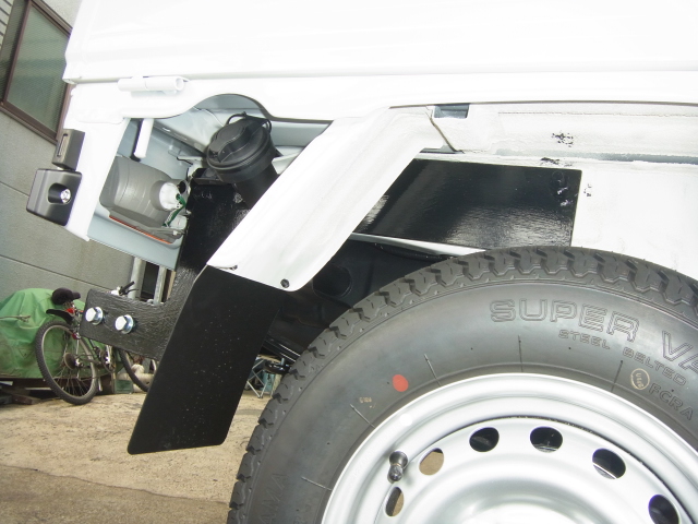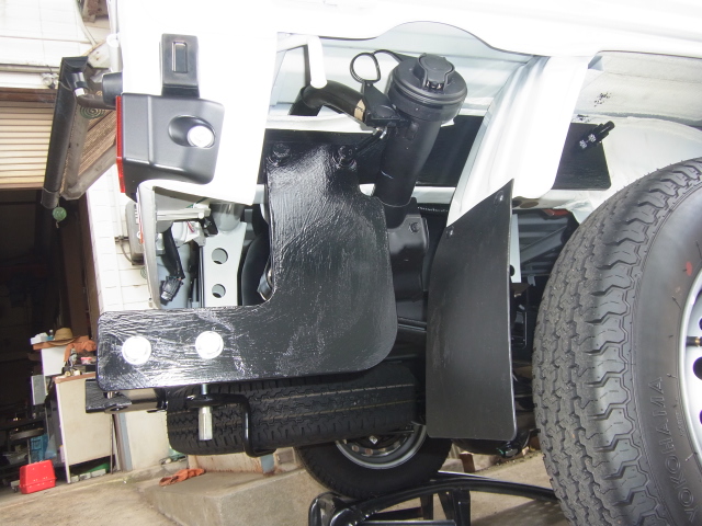 鉄板は薄いし、付けたい部分にリーフスプリングのシャックル、給油口、スペアタイヤ、一体構造のフェンダーと邪魔な物ばかり。でもなんとか一日で作業を終わらせてます。