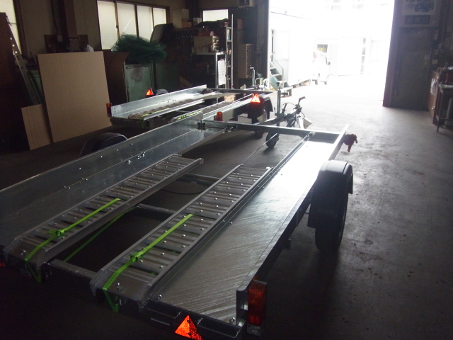 工場の中に納車準備中のW76車載トレーラー二台