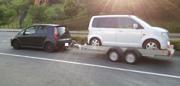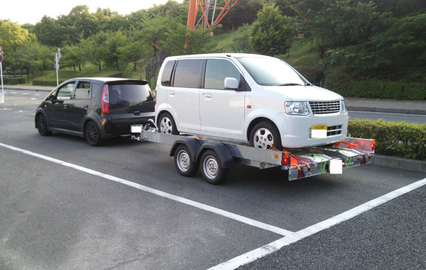 6/16に納車させて頂いてたのですが、ここ数日あまりにバタバタしていたので今更ブログアップ 三菱コルトに特注ヒッチメンバー取り付けしてW84車載トレーラーを納車しました。 本来はシルビアを積む予定ですが、引き取りにお越しになったEKワゴンを積んでお帰りに。 FF車のEKワゴンはバックで積むと、重心バランスが取れます。 お客様、かなり悩んだ末のコルトでの牽引。 凄い組み合わせでしょう。 こちらも事前に車両確認したときに、ヒッチメンバーは無理有るけど何とかなるやろと。 お客様が三菱の整備士でしたので、リスクを説明の上、定期点検必須でお受けすることに。 実際にEKワゴンを積んで、弊社周辺を私が運転して試運転。 マニュアルミッションで意外と軽快に走り、拍子抜け。ターボが効くと結構パワフル。 軽量化されたシルビアなら何とかこの状態で走れそう。 但し、無理は絶対禁物 http://www.snotr.com/video/7516/Fishtail_fail 安全な速度での牽引走行を A様、弊社にご依頼下さいまして誠にありがとうございました。 |