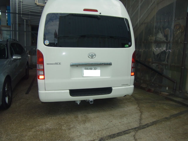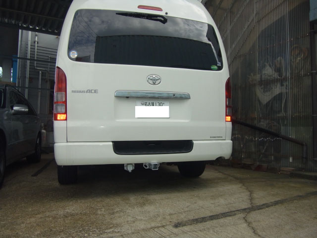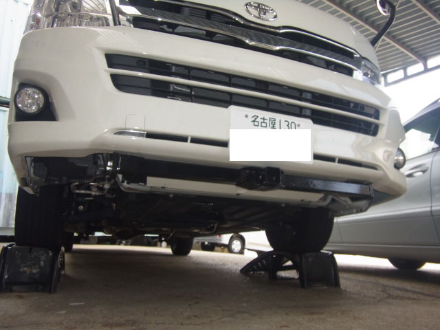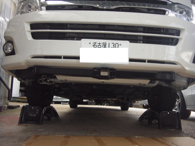 220系ハイエーススーパーロングバンにヒッチメンバー取付と同時に、フロントヒッチメンバーも特注で取り付けしました。