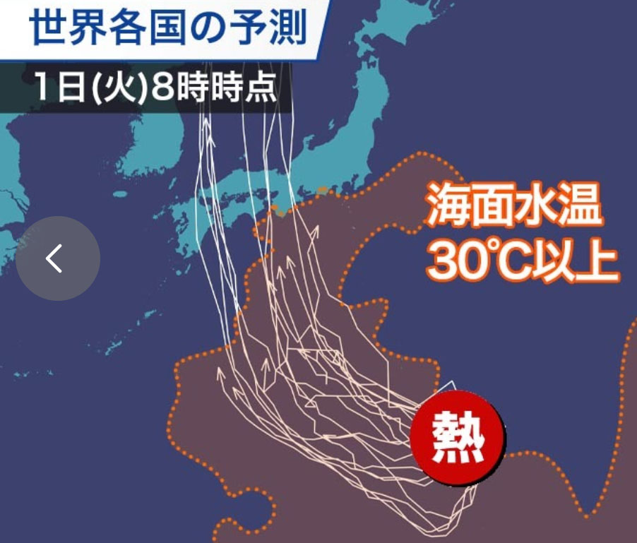今日現在も九州に接近している台風9号ですが、 もっと懸念されるのは週末に日本に近づく台風10号です。 その後も台風は発生し、徐々に進路は東にずれて行く事でしょう。 現在小笠原近海にいますが、今後勢力を急速に拡大すると予想されています。 海水温度が高すぎます。 マックスパワーで上陸するかもしれません。 九州地方は長梅雨の洪水被害が出た所も多かったです。 8/30の海況速報 http://www.mpstpc.pref.mie.lg.jp/sui/kaikyo/movie/movie.htm ここ近年の台風は接近してから急速に天候悪化しています。 記憶に新しいのは関西に甚大な被害をもたらした台風21号 自ら身を守る行動を。 皆様お気を付けください。 |