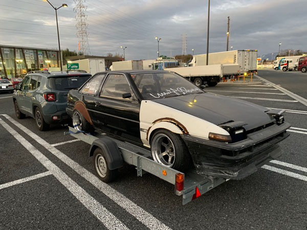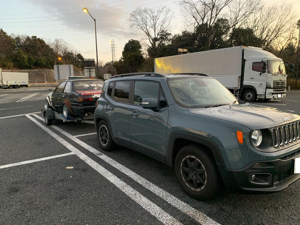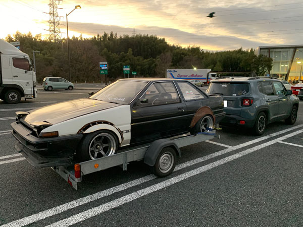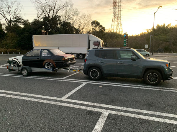 牽引車はジープ レネゲード いかにもドリフト系の方のお車ですね。 背景にAE86が数台写ってるけどお仲間かな これからも楽しんで下さい http://fukushin-ind.com/ |