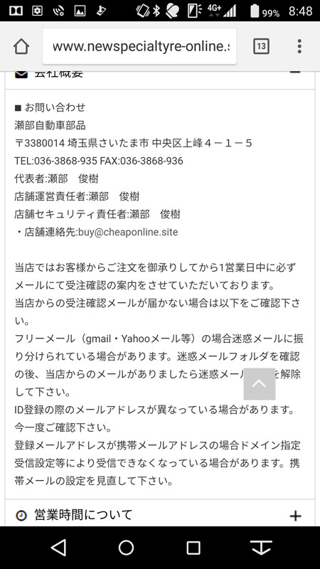 ページ内容は安全な画像として下記に表示してあります。 以前の詐欺サイト http://sunrocky.blog-rpg.com/Entry/1227/ あきらかに安い。 代引便が使えない。 受注生産でアウトレットなんてあり得ない。 サイトの読み込みに時間がかかる(海外サーバー複数経由) 足が付かない様に暫くするとサイトが無くなる。 何故か検索上位に有る。(野放しなのは検索サイトにも責任があると思う) 表記してある所在地が、Googlemapなどで見ると公園とか道路とか。 同様に電話番号も架空。 酷い場合は、振込先名義がチャイナ人。 詐欺だと思って下さい。 この様なところにお金を振り込んでも商品は届きません。 販売主体の電話番号 さいたま市なら市外局番、048 これもおかしい 愛知県警に通報しました。 |