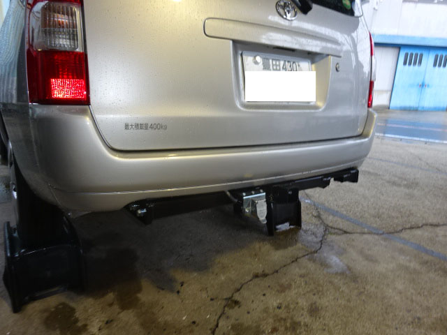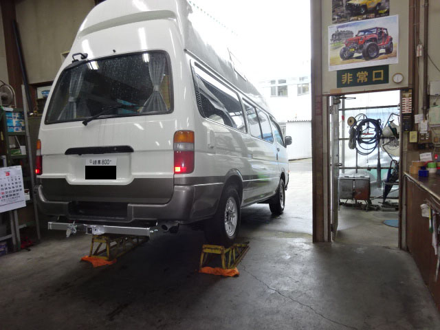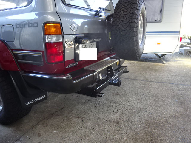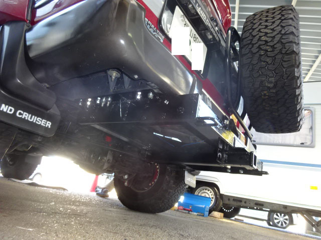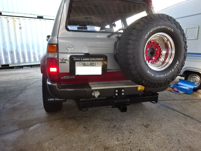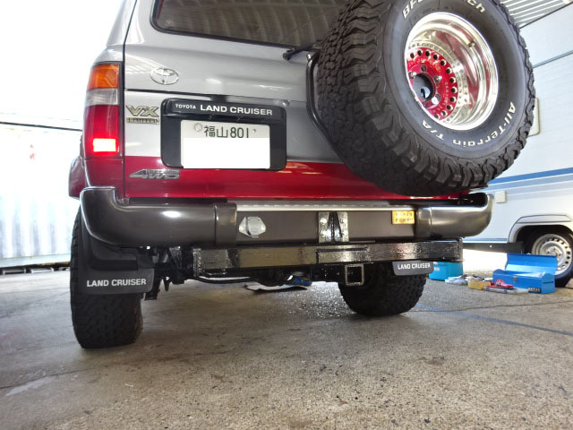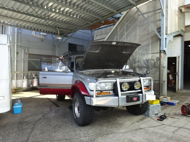 ランクル80が入庫し、アメリカントラベルトレーラー牽引用の特注ヒッチメンバーとブレーキコントローラー取付しています。