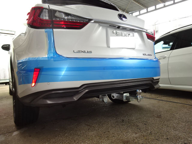 レクサスRX 20系 HV にヒッチメンバー取付作業をしています。