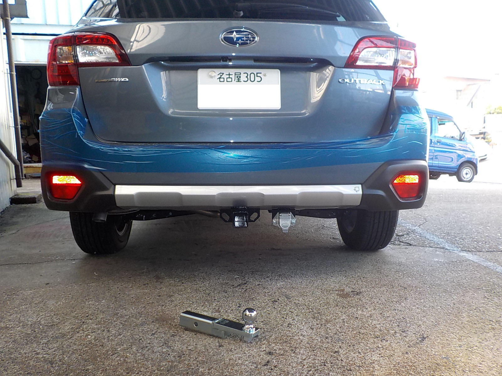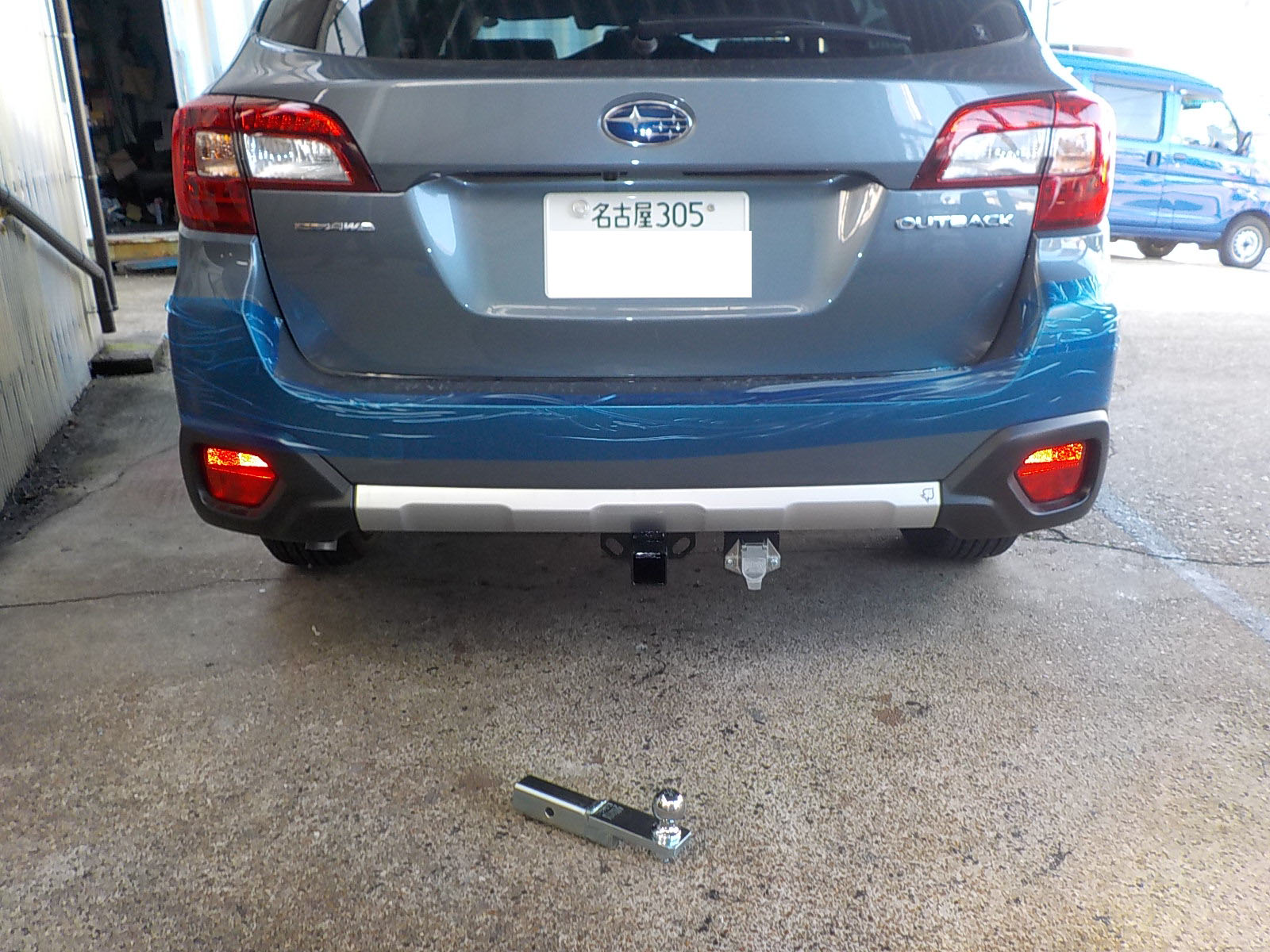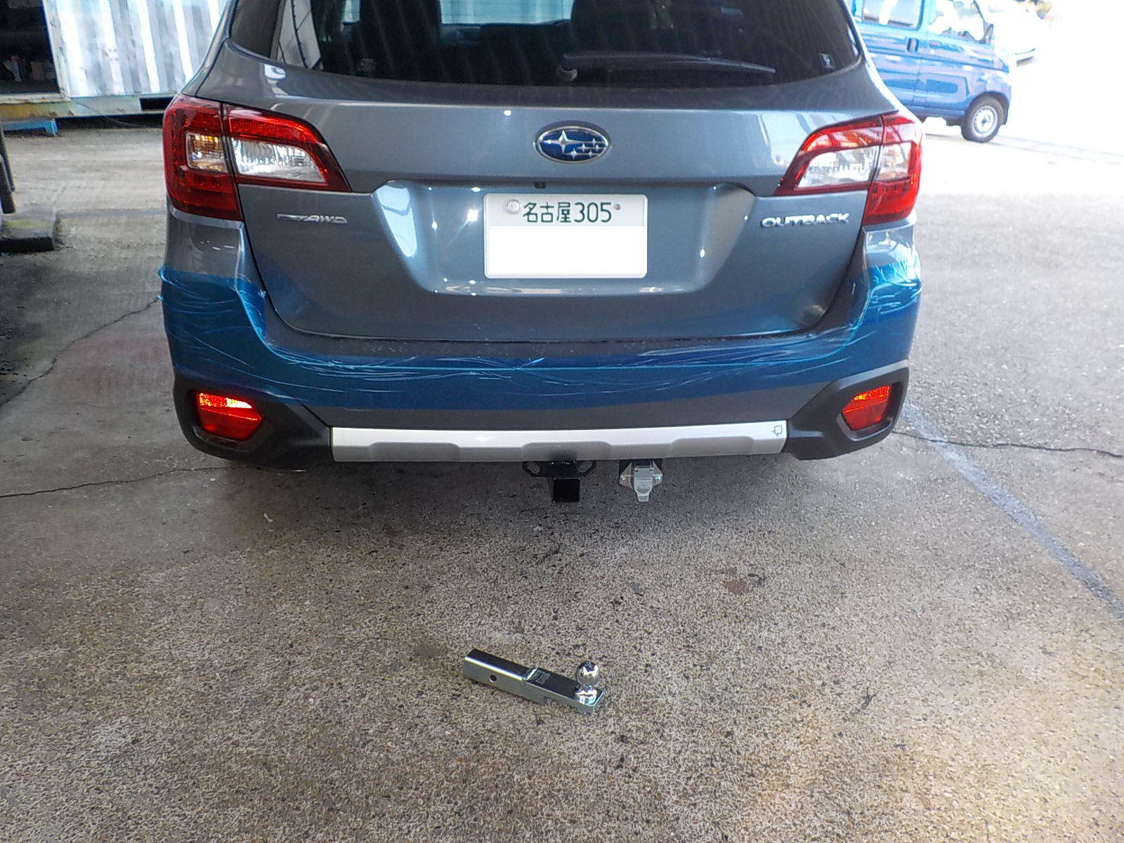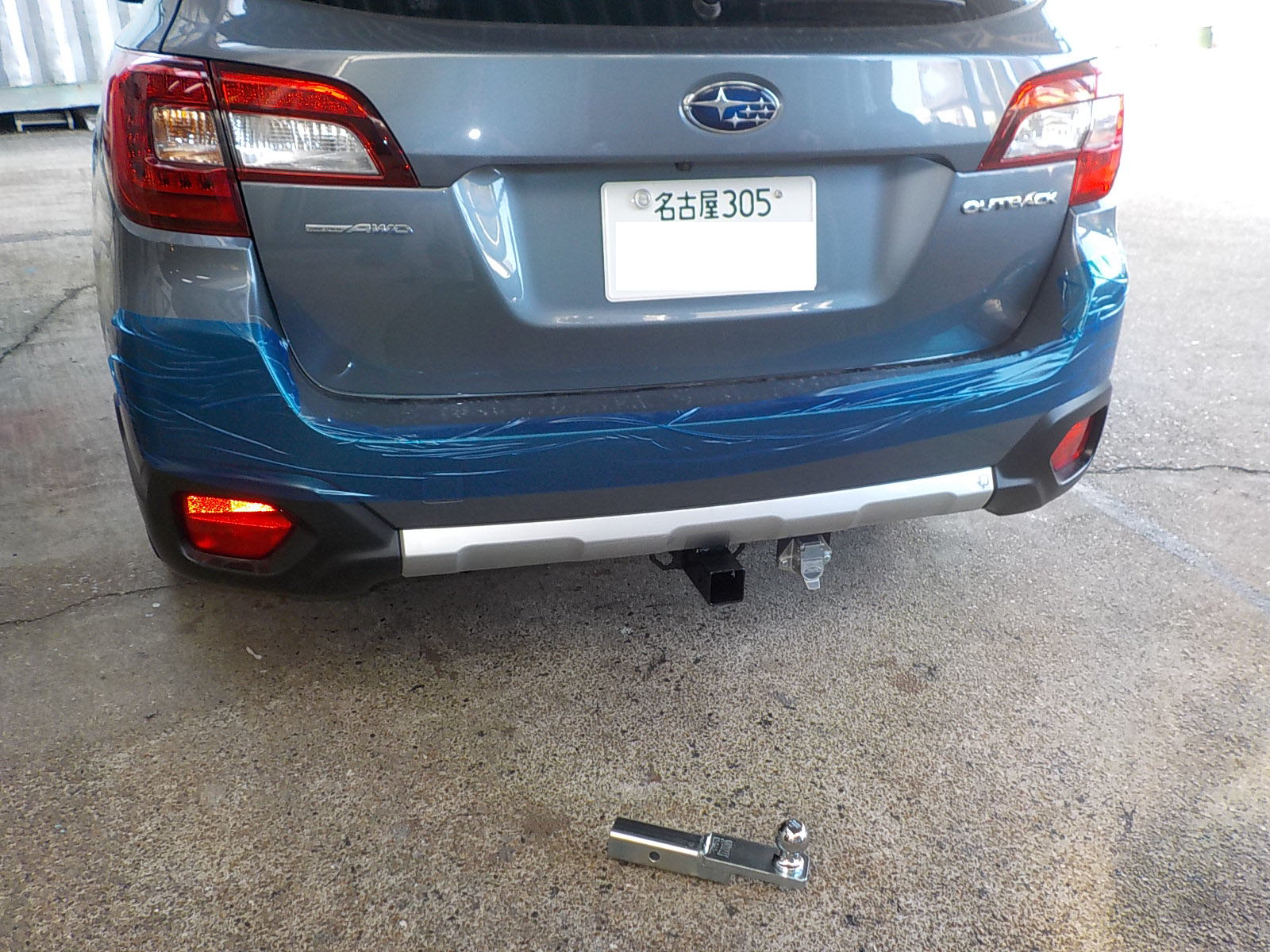 新型スバルアウトバックDB9が入庫し、特注ヒッチメンバー製作しています。